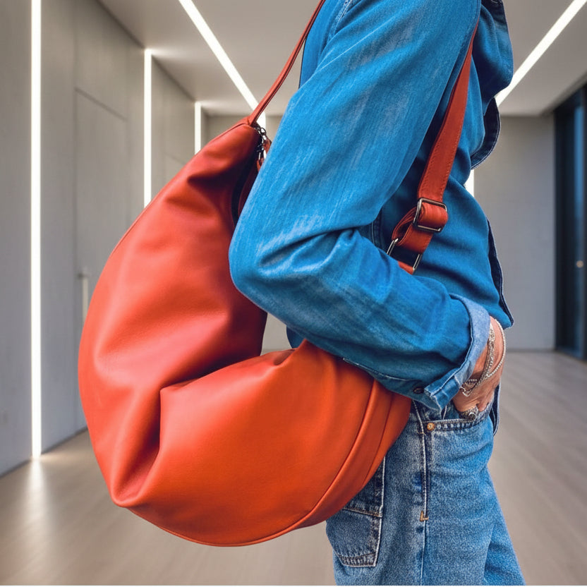 Una borsa morbida e fluida, dal volume organico, ispirata al movimento dell'acqua e alla materia viva della città.