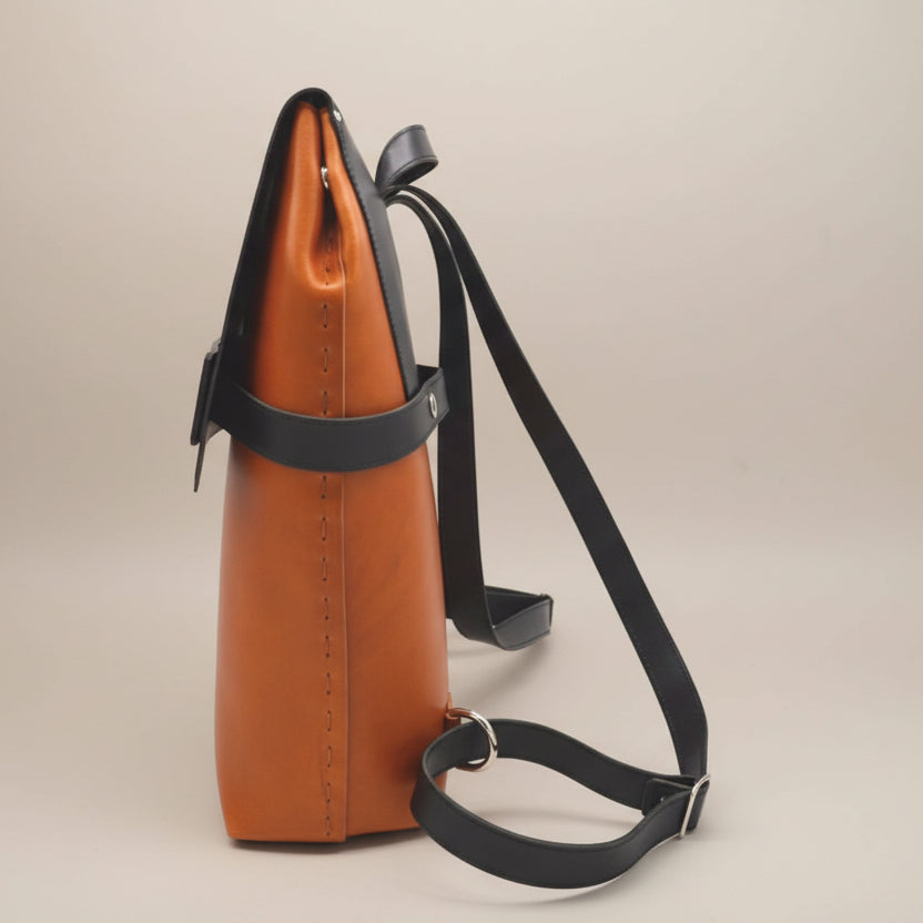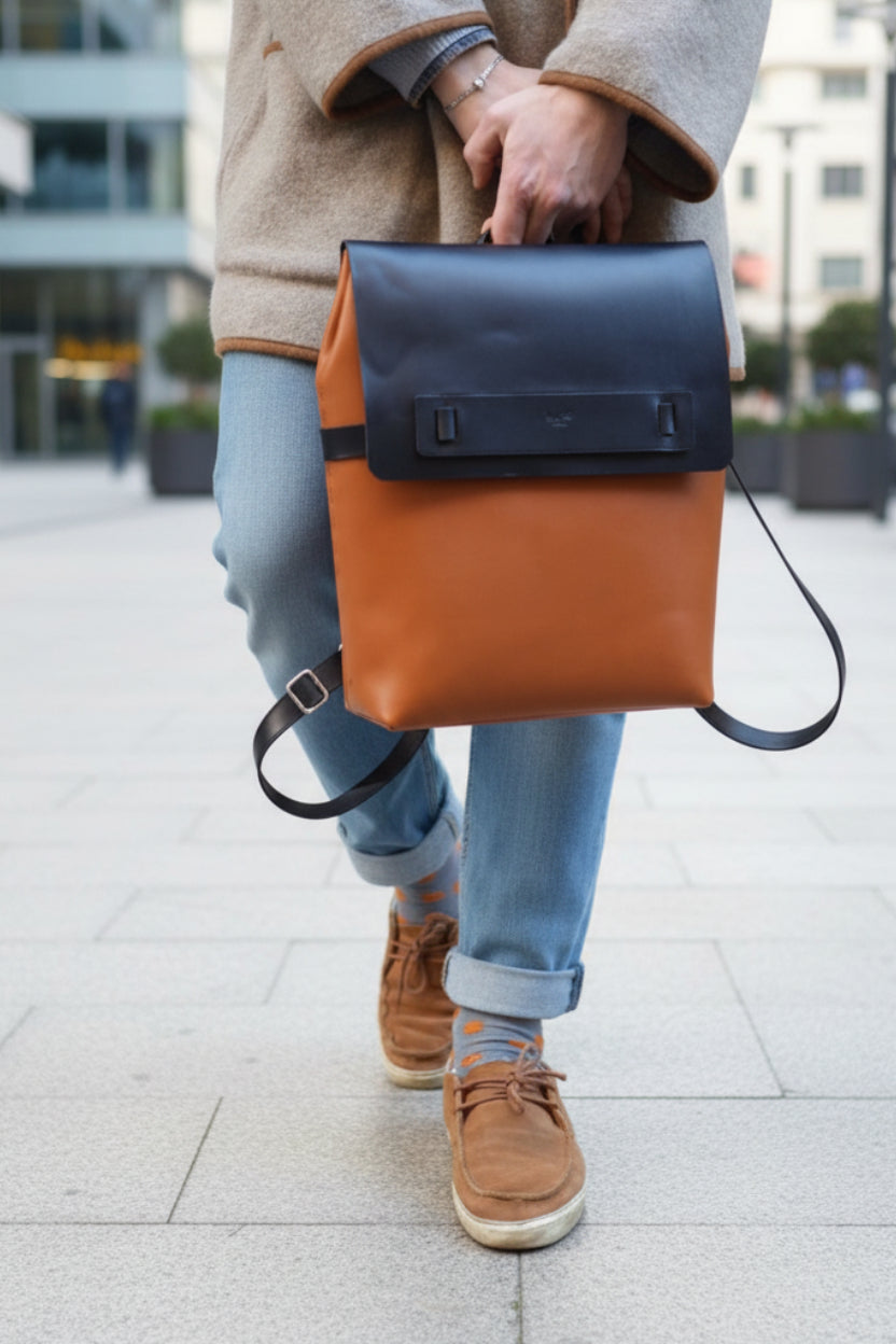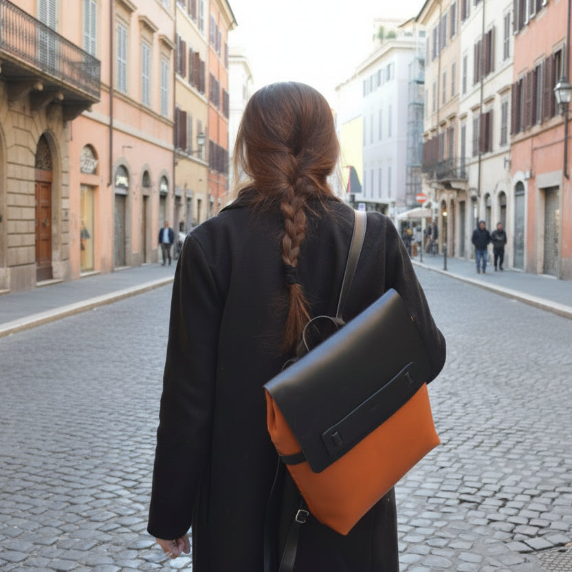 Zaino artigianale in cuoio, realizzato a mano in Italia. Compatibile con laptop e pensato per la vita urbana, è dotato di apertura di sicurezza sul retro che impedisce l'apertura frontale mentre è indossato, riducendo il rischio di borseggio. Essenziale nel design, affidabile nell'uso quotidiano.